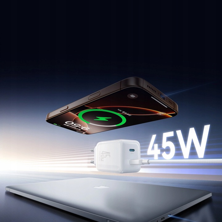Moc 45 W gwarantuje szybkie ładowanie zgodne ze standardem Power Delivery, a technologia GaN zapewnia mniejsze rozmiary i lepszą efektywność energetyczną. Dzięki temu adapter nie zajmuje dużo miejsca i jest łatwy do przenoszenia.