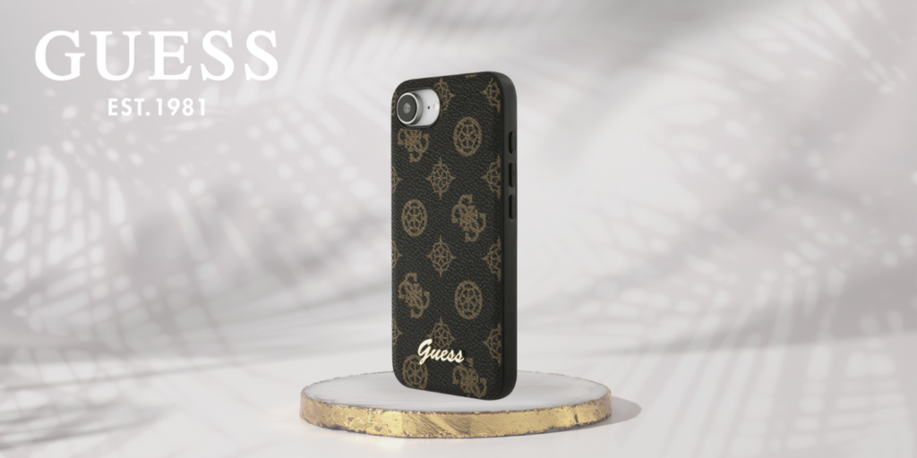 Etui od marki modowej, nie technologicznej — i to jest jego siła. Guess Peony Script Logo to etui, które wygląda jak akcesorium modowe, nie plastikowa nakładka. Skóra ekologiczna, złote logo Guess i kwiatowy wzór przyciągają wzrok.