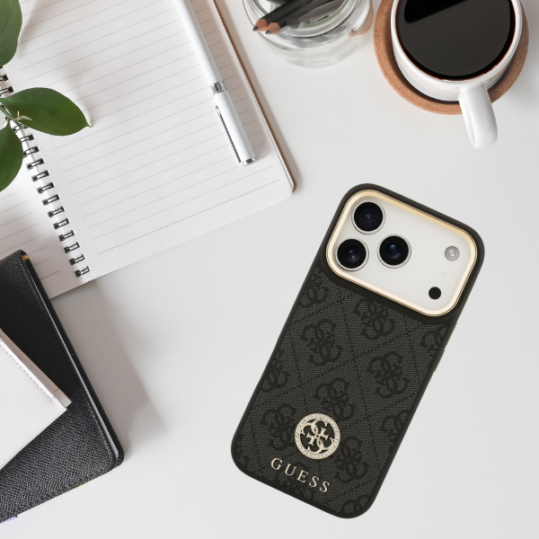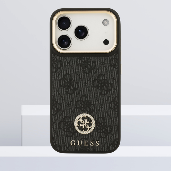 W dolnej części etui znajduje się ozdobny emblemat Guess 4G, udekorowany połyskującymi kryształkami, a całość dopełnia subtelne logo Guess.