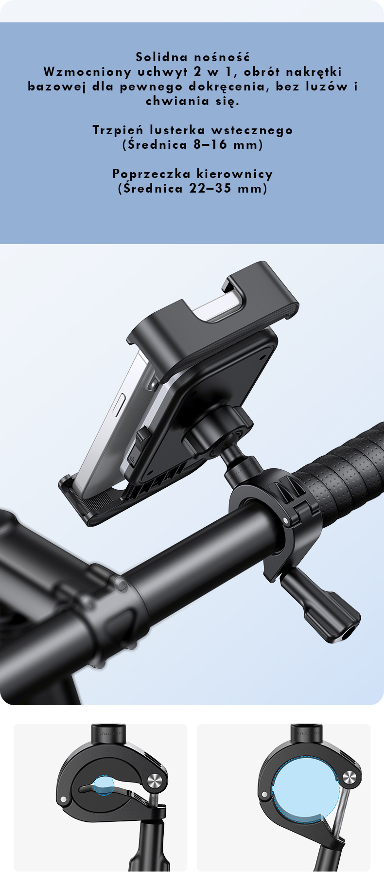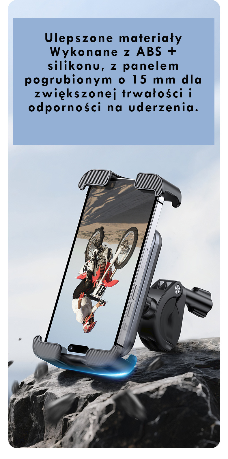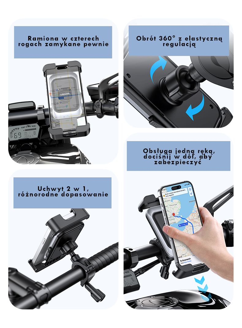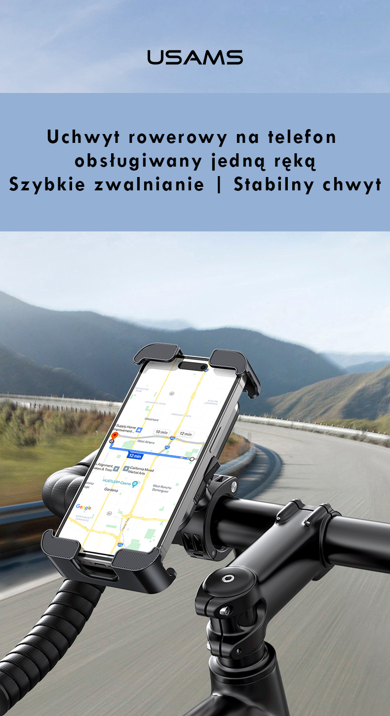 USAMS ZJ082 ist eine robuste Halterung für das Handy am Fahrrad, Roller und Motorrad mit einem stabilen, allumfassenden Griff. Die Konstruktion ermöglicht eine Drehung um 360°, sodass du den Bildschirm einfach im Hoch- oder Querformat einstellen kannst. Die Montage erfolgt am Lenker oder am Spiegelstiel – sicher und ohne großen Aufwand.
