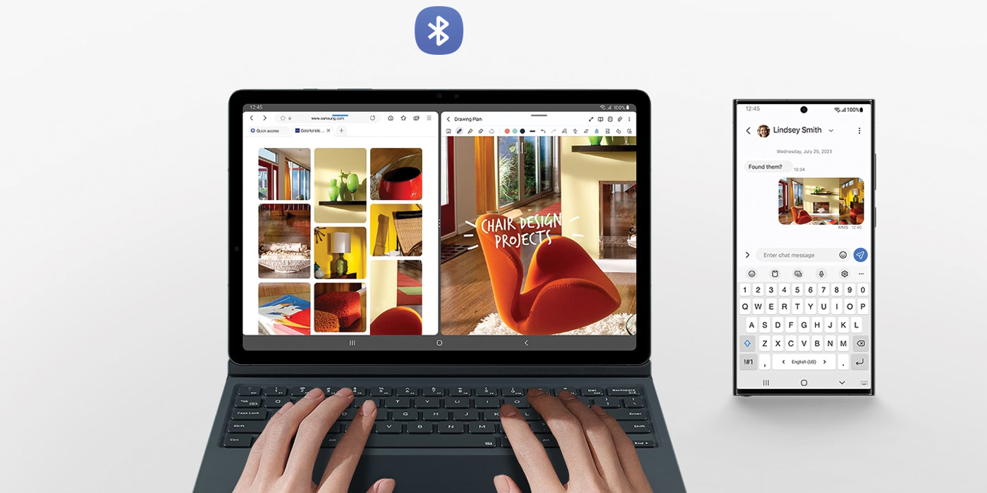 Mit der kabellosen Tastaturfreigabe können Sie ganz einfach eine Verbindung zu anderen Galaxy-Geräten herstellen und nahtlos auf ihnen tippen oder navigieren. Wechseln Sie frei zwischen den Geräten und nutzen Sie Ihr Telefon wie ein Tablet.