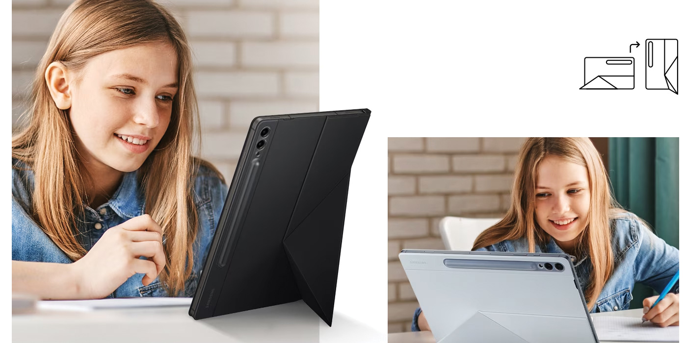 Drehen Sie Ihr Tablet so, wie Sie wollen. Egal, ob Sie es lieber im Hoch- oder im Querformat aufstellen, die Smart Book Cover-Hülle bietet effektiven Schutz. Die Rückseite lässt sich nach unten klappen, um eine stabile Basis für das Hoch- und Querformat zu schaffen.