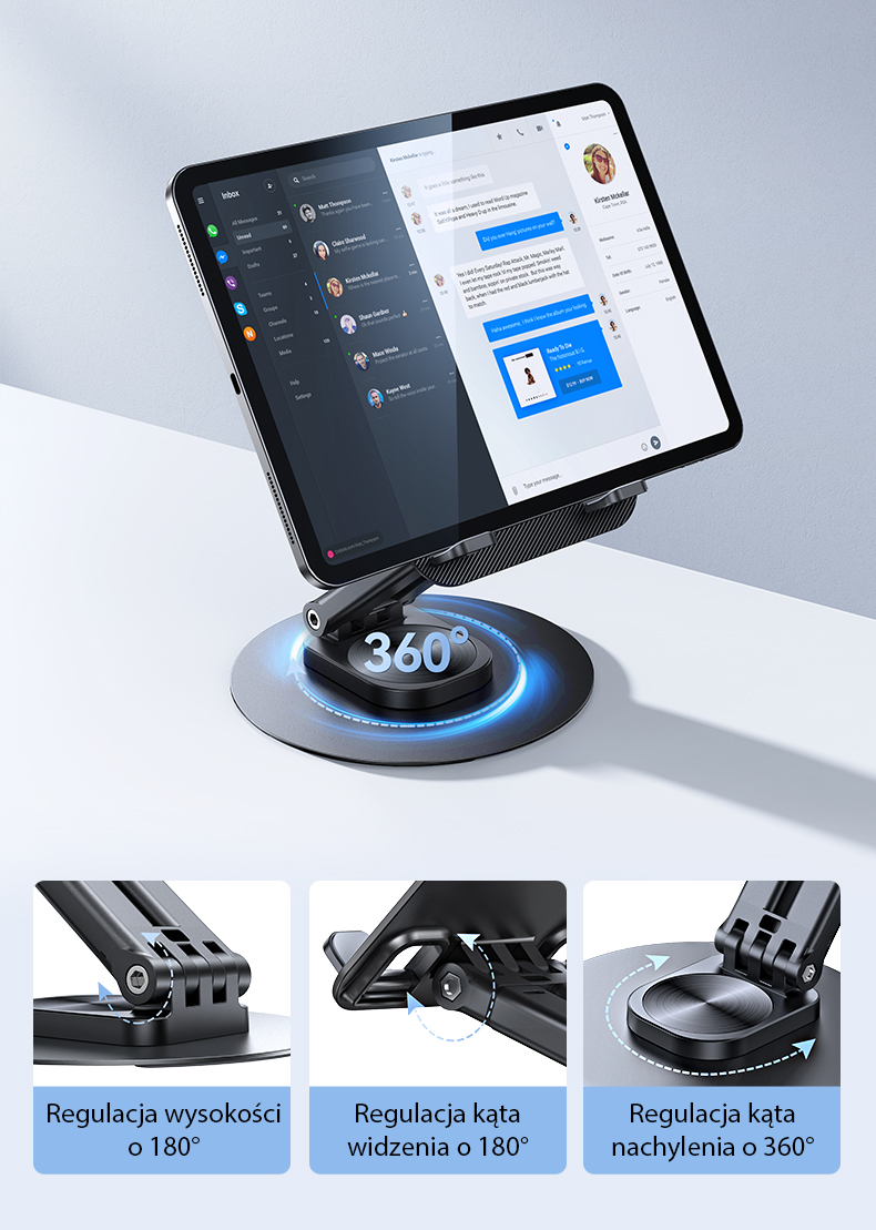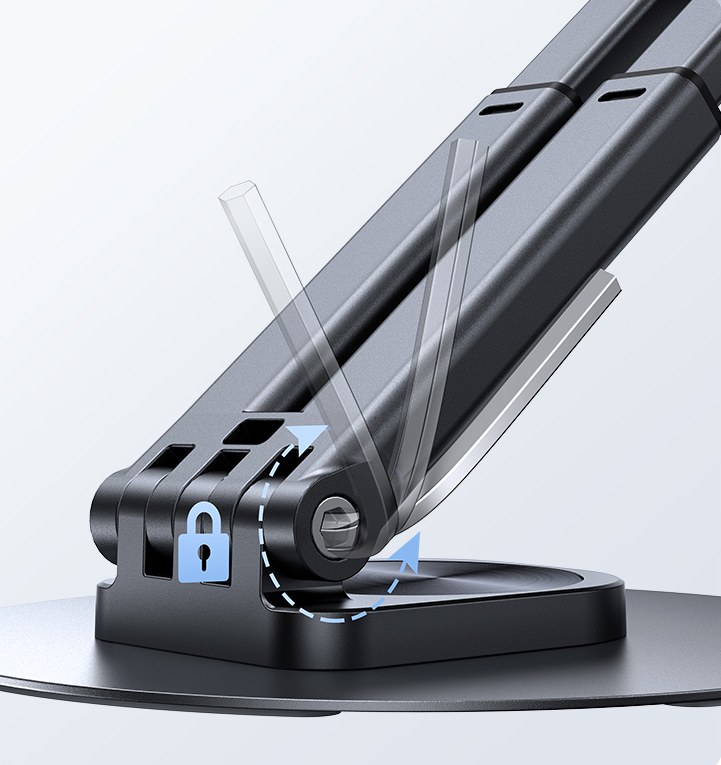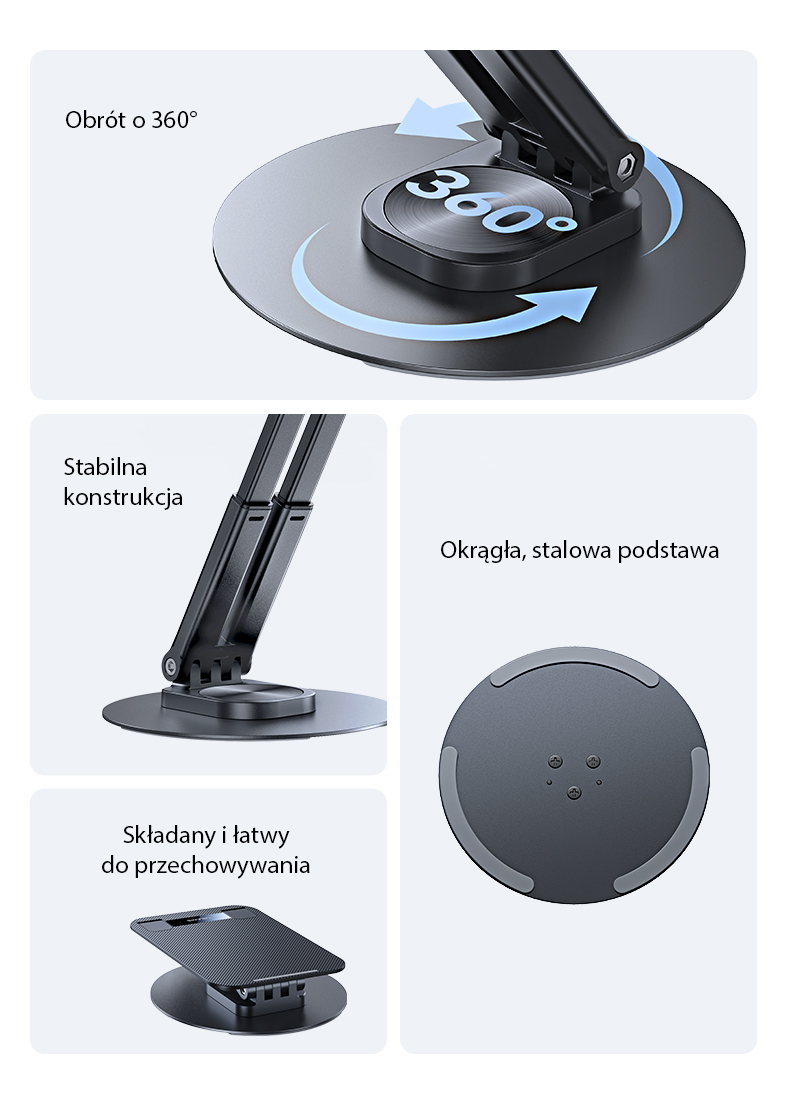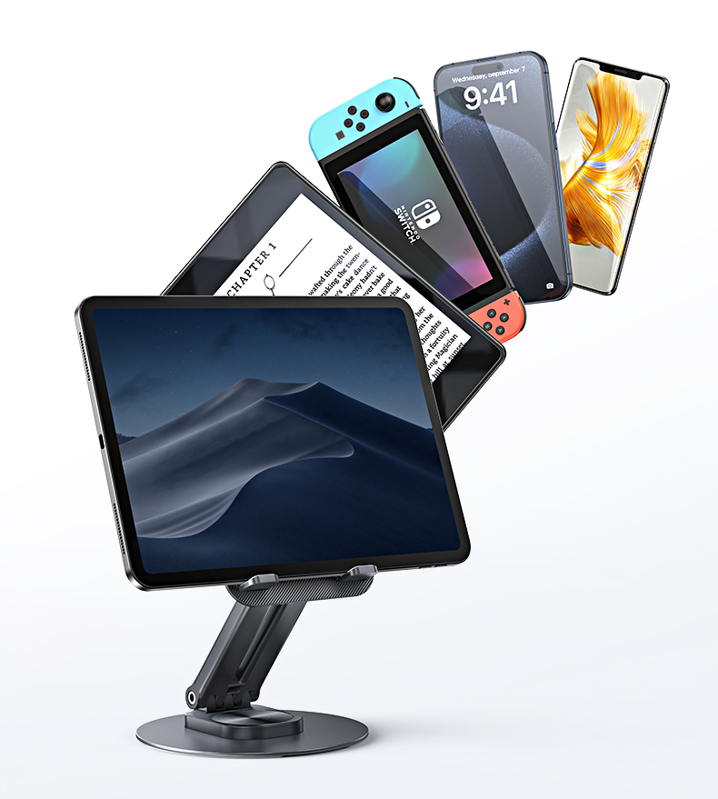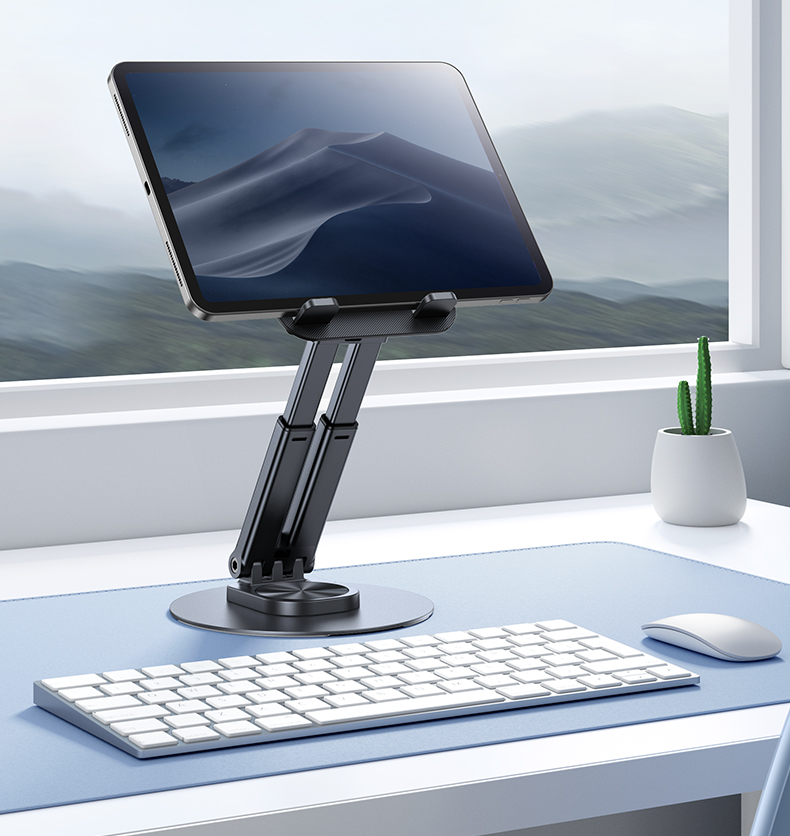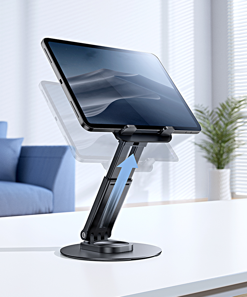 Der Ständer bietet volle Flexibilität bei der Einstellung dank einer 360°-Drehung, die eine einfache Anpassung des Betrachtungswinkels ermöglicht. Die stabile Konstruktion und die runde Basis aus Kohlenstoffstahl gewährleisten Sicherheit und Langlebigkeit, selbst bei intensiver Nutzung. Darüber hinaus ist der Ständer durch seine klappbare Bauweise leicht zu verstauen und zu transportieren, ideal für Reisen oder zur Arbeit. Es ist eine praktische Lösung, die Funktionalität mit Komfort verbindet.