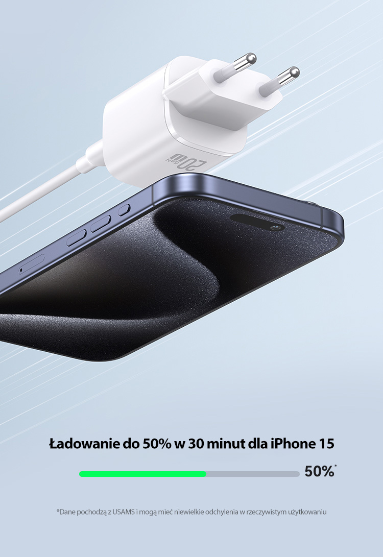 Dank der Leistung von 20W bietet das Ladegerät ein starkes und effizientes Laden, das es ermöglicht, das Gerät in nur 30 Minuten auf 50% aufzuladen. Dies ist eine ausgezeichnete Lösung für Menschen, die ständig in Eile sind.
