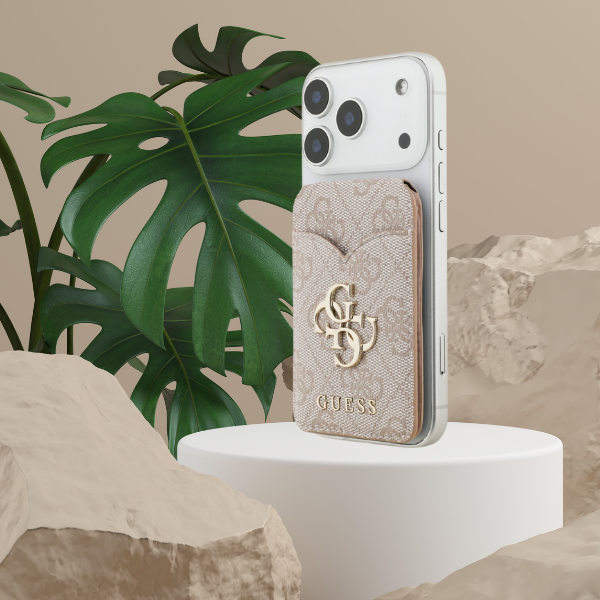 Portemonnaie mit Spiegel Guess 4G Stand & Mirror MagSafe ist stilvoll und praktisch. Zusatz zum Smartphone. Magnetische Halterung MagSafe ermöglicht es auf einfache Weise, eine Geldbörse an der Rückseite des Telefons zu befestigen. MagSafe oder kompatiblem Etui, das schnellen Zugang zu den wichtigsten Karten bietet.
