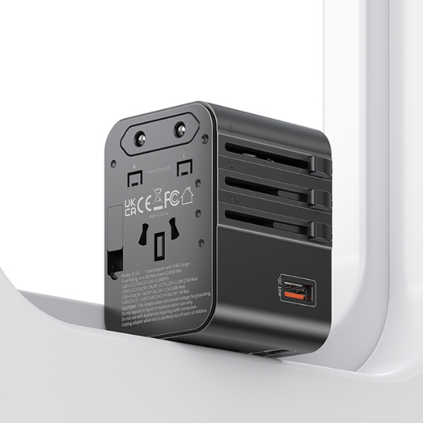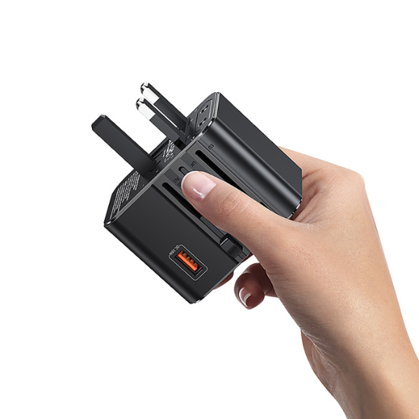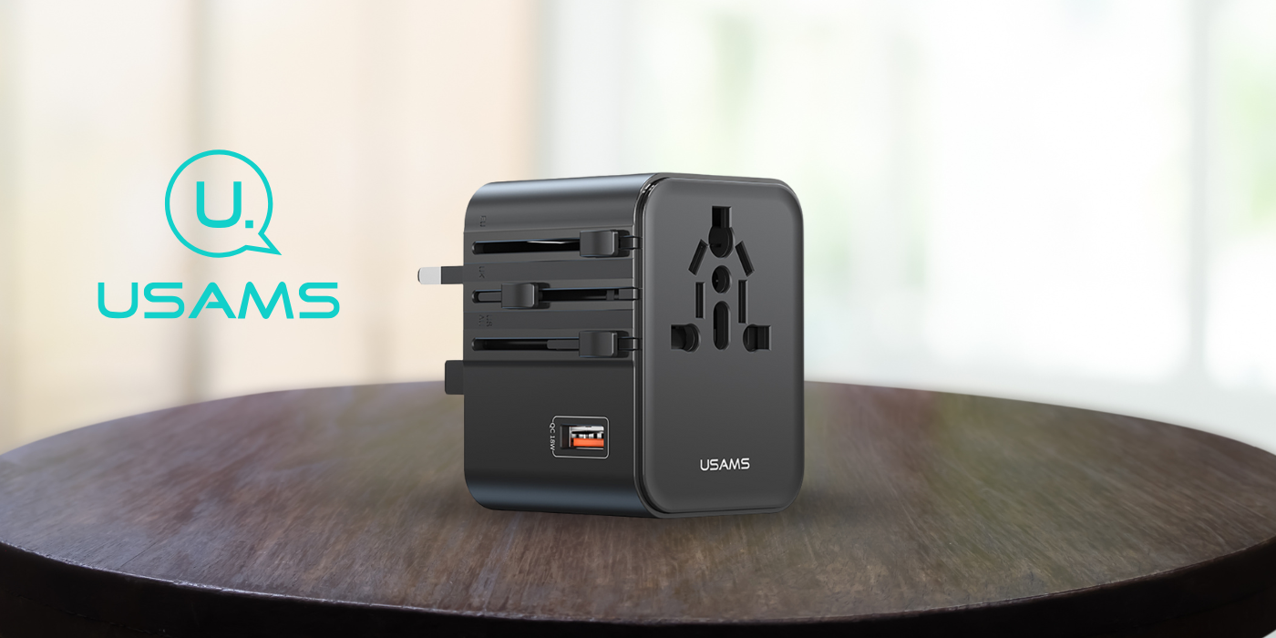 USAMS Reiseadapter bietet außergewöhnliche Leistung und Vielseitigkeit, indem er verschiedene Stromversorgungsstandards unterstützt. Der Adapter ist mit einer Buchse ausgestattet USB-A und 2 x USB-C, was das gleichzeitige Laden mehrerer Geräte ermöglicht.