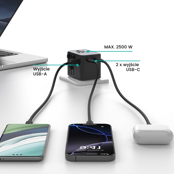 Dieser universelle Ladeadapter ermöglicht das Laden von bis zu bis 4 Geräte gleichzeitig. Ausgestattet mit USB-A-Anschluss, zwei USB-C-Anschlüsse und universell Das Wort "gniazdo" wird auf Deutsch als "Nest" übersetzt. AC bietet Vielseitigkeit und Komfort beim Laden verschiedener Geräte, zu Hause und auf Reisen.
