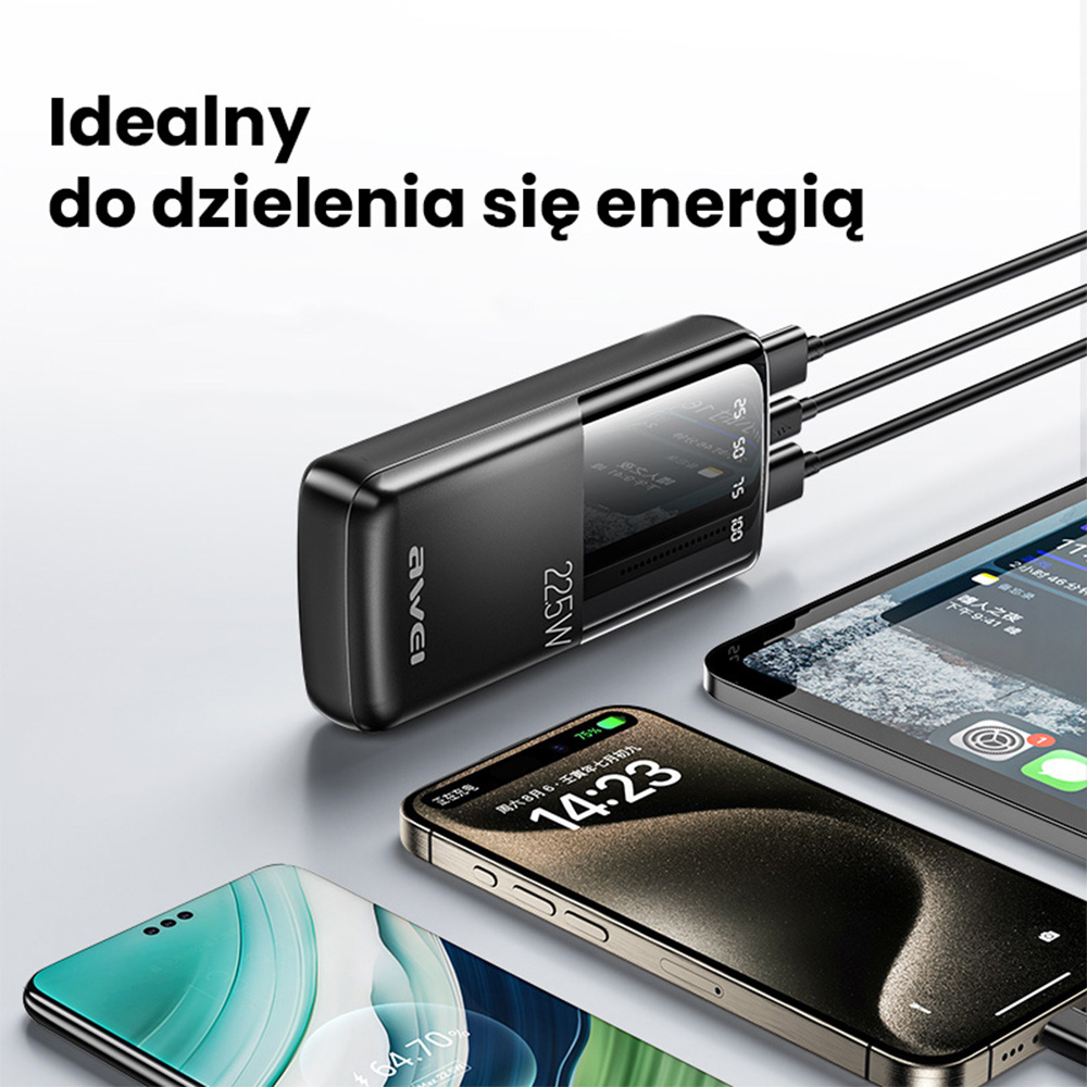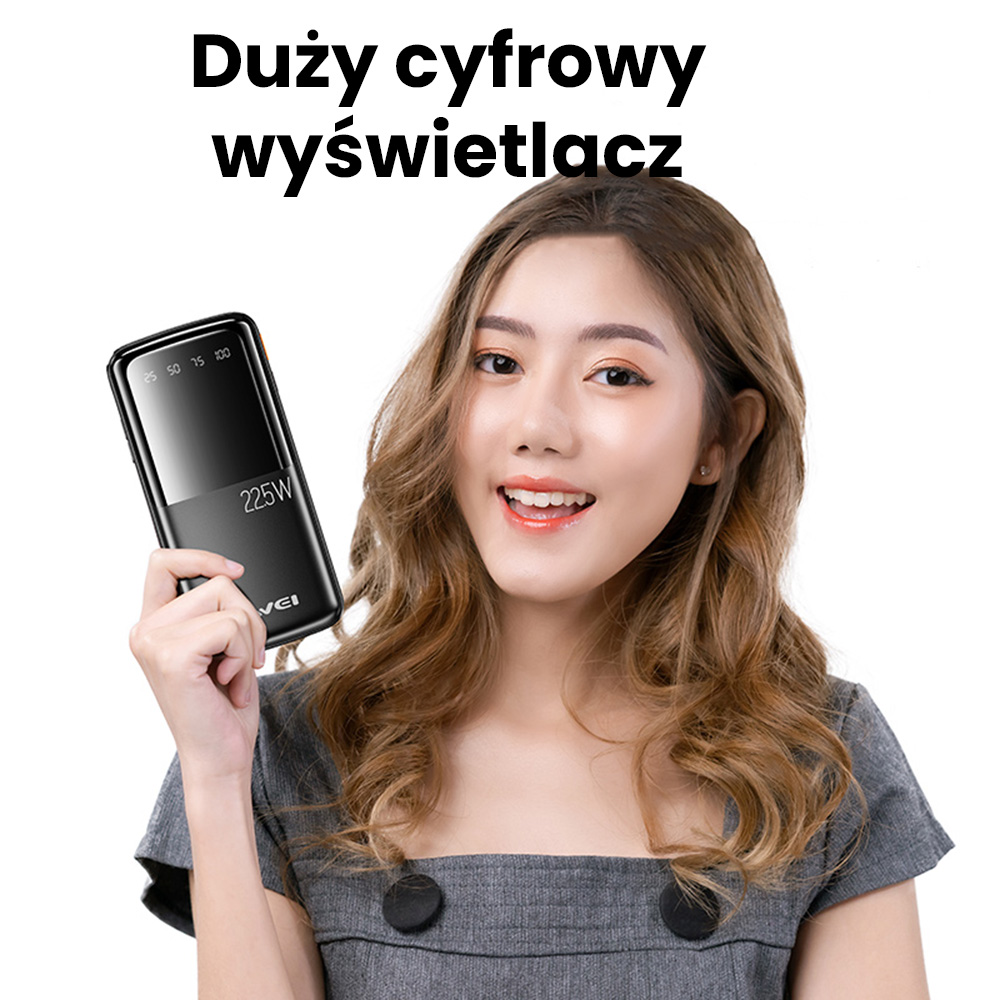 Die Powerbank AWEI P13K ist mit einem großen digitalen Display ausgestattet, das die aktuelle Batterieladung überwacht. Dies ist ein nützliches Werkzeug, das es ermöglicht, den Energiezustand zu verfolgen und das Laden zu verwalten, wodurch die Kontrolle über die Stromverfügbarkeit auch auf Reisen gewährleistet wird. Das digitale Display bietet nicht nur Funktionalität, sondern verleiht dem Gerät auch ein modernes Aussehen, das ihm Eleganz verleiht.