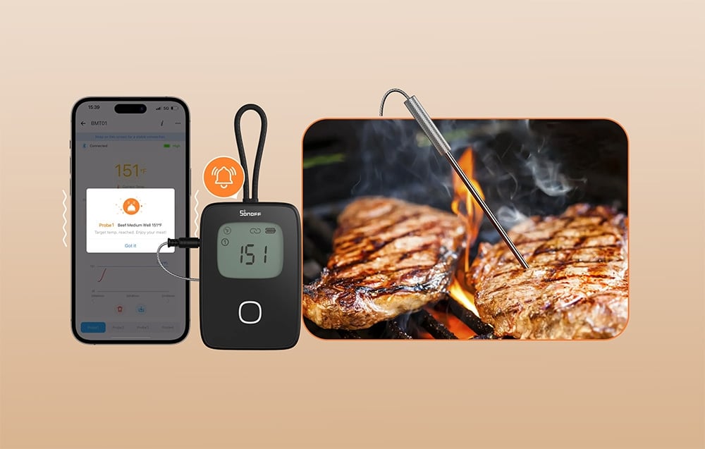 SONOFF BMT01 informiert dich mit einem akustischen Signal, wenn das Fleisch die eingestellte Temperatur erreicht, sodass du das Gericht im perfekten Moment vom Grill nehmen kannst. Darüber hinaus kannst du eine frühzeitige Warnung einstellen, die dir hilft, dich auf das Servieren vorzubereiten, sowie die Temperatur des Ofens oder Grills überwachen und einen Alarm erhalten, wenn sie den festgelegten Bereich überschreitet.