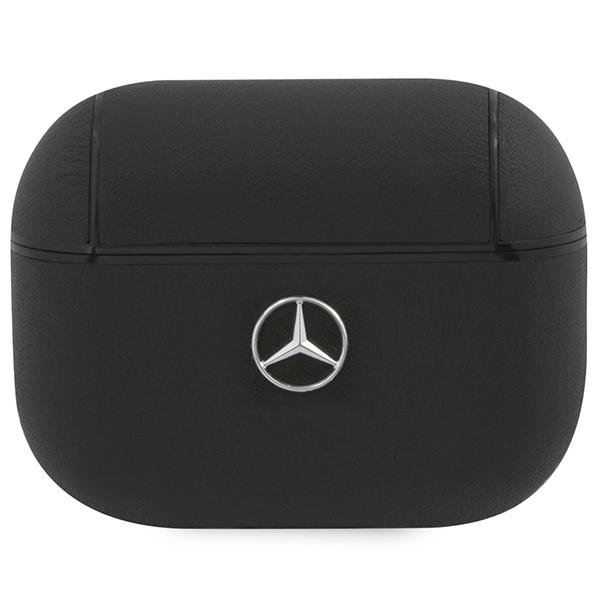 A charging case for AirPods headphones branded by one of the most popular automotive companies in the world. The case is made from a combination of polycarbonate and genuine leather featuring a metallic Mercedes-Benz logo.