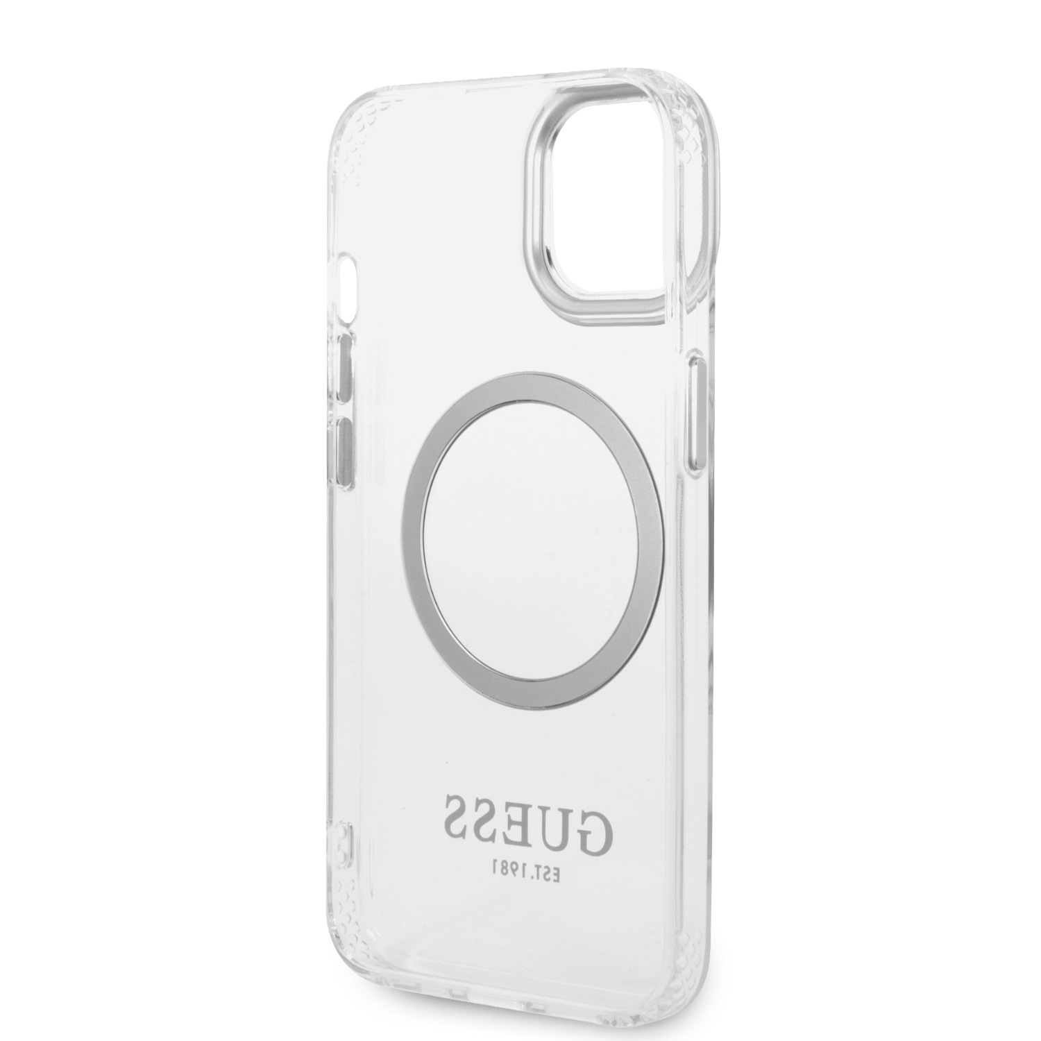 The case perfectly highlights the unique design of your iPhone, adorned with silver elements such as a frame around the lenses, buttons, and the Guess logo. The case is equipped with a magnetic ring compatible with the MagSafe wireless charger, ensuring fast and easy charging. The magnetic ring perfectly matches the color scheme of the case.