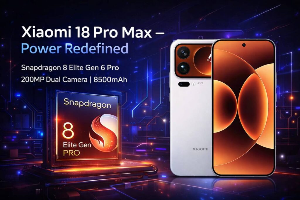 Xiaomi 18 Pro appeared in the first renders with a dedicated AI button on the side frame, two 200 MP cameras with LOFIC HDR 3.0, a rear AMOLED display (returning after Xiaomi 17 Pro) and a 7000 mAh battery. The larger Pro Max will get 8500 mAh and an expanded audio set. Both models are powered by Snapdragon 8 Elite Gen 6 in a 2 nm process — the Pro variant has a higher clock speed than the base model.