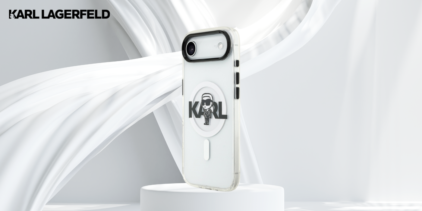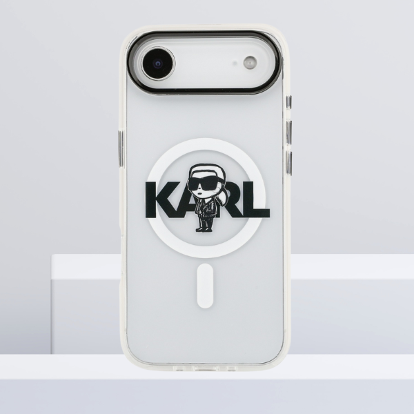 The back part is adorned with printed motif of Karl Lagerfeld with a large inscription KARL, supplemented with visible MagSafe ring.