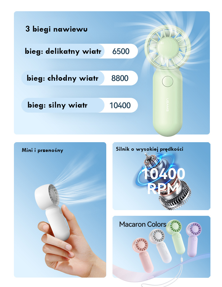 It is powered by a built-in 500 mAh battery, which provides up to about 2 hours of operation on the lowest setting and about 36 minutes on the highest. Charging is done via a USB cable (DC 5V), and the full process takes about 1.5 hours. The LED indicator informs about the charging status: a flashing light means charging is in progress, while a steady light indicates a full charge. With a power of 3 W, the device operates efficiently and quietly, offering comfort for use in the office, at home, or outdoors. The USAMS ZB354 is available in four attractive colors – white, purple, green, and pink – allowing it to match individual styles. It is the perfect combination of mobility, convenience, and effective cooling, all enclosed in a minimalist, pocket-sized form.