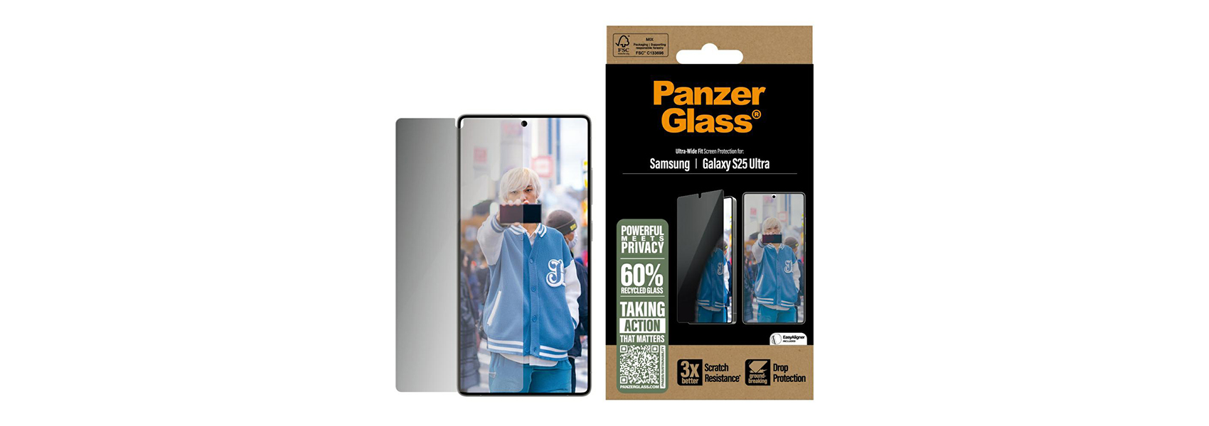 Check out our protective glass PanzerGlass®! Made from 60% recycled glass, it protects your personal belongings from nosy neighbors on the train, in a café, or at the office. The privacy filter ensures that the content of your screen is invisible to anyone except you. It even has a smudge-resistant coating that reduces fingerprints and grease marks and ensures 100% compatibility with the ultrasonic fingerprint reader on the screen, giving you peace of mind that your phone will unlock smoothly every time.