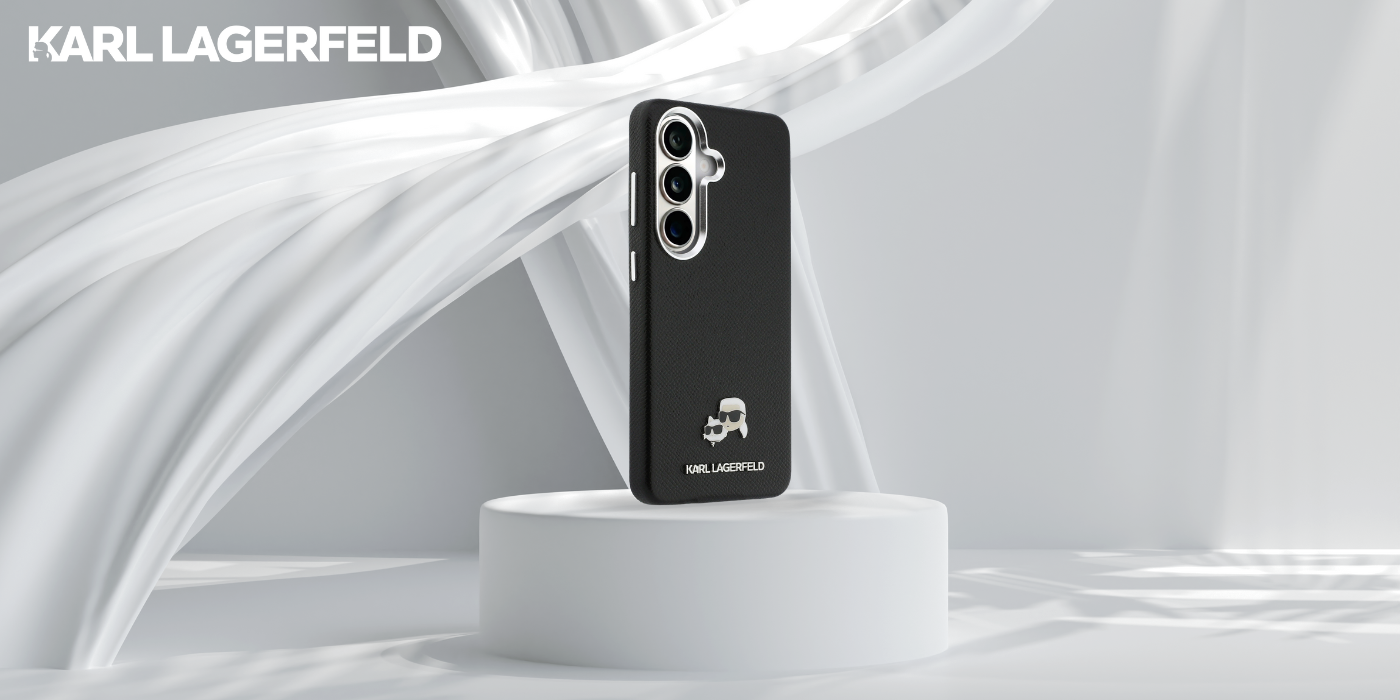 Plecki zdobi charakterystyczny metalowy pin z podobiznami Karla Lagerfelda i jego kotki Choupette, nadający akcesorium unikalnego, modowego charakteru. Całość dopełniają aluminiowa ramka aparatu oraz przyciski boczne w srebrnym kolorze, podkreślające luksusowy charakter produktu. W dolnej części znajduje się napis „KARL LAGERFELD”, który dodaje elegancji i wyjątkowego stylu.