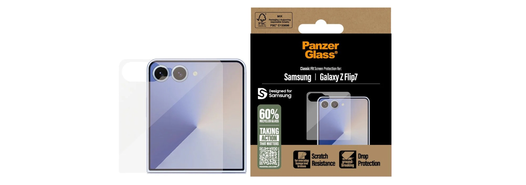 This model of tempered glass was created with the environment in mind. The use of recycled materials is just one step towards more sustainable production. Additionally, the packaging has been reduced by about 30% compared to previous versions, while maintaining full functionality and safety in transport. The cardboard containing the glass is made from FSC™ certified paper, ensuring responsible sourcing of the material. By choosing PanzerGlass® Classic Fit, you are not only protecting your phone but also making a conscious decision that supports care for the planet.