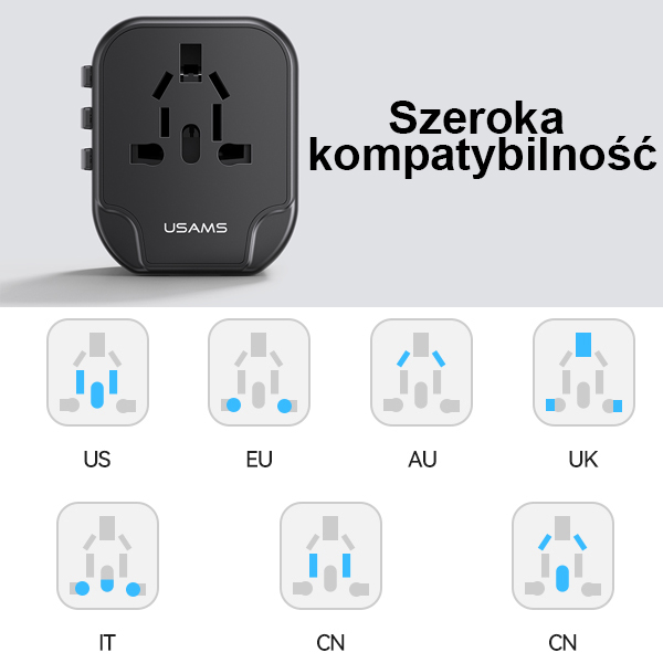 The universal travel adapter from the well-known and respected brand USAMS works in over 200 countries worldwide with four different types of plugs - US / AU / EU / UK. With this device, you only need one adapter for your travels around the world.