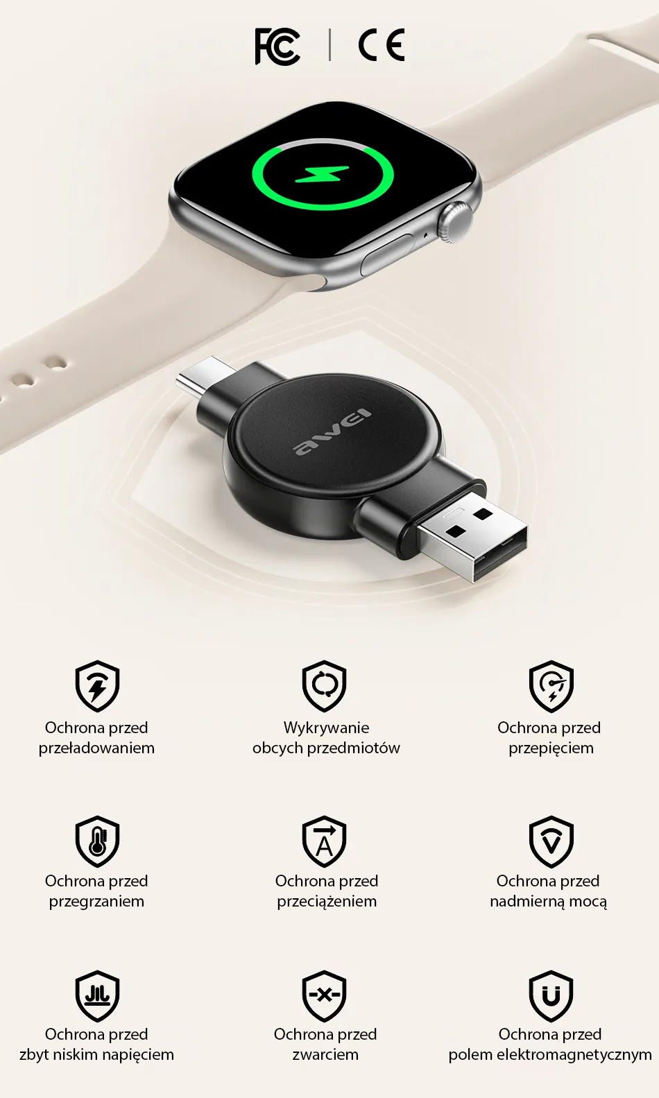 Equipped with a high-quality core made of pure copper, the charger guarantees stable and efficient charging that does not overload the device's battery. It not only ensures high effectiveness but also takes care of your equipment's safety. Compliance with strict standards and the use of 9 levels of protection, such as overheating, overcharging, surge, or short-circuit protection, mean you can charge your smartwatch without any worries. This solution is designed for safe and fast energy replenishment, regardless of the situation.