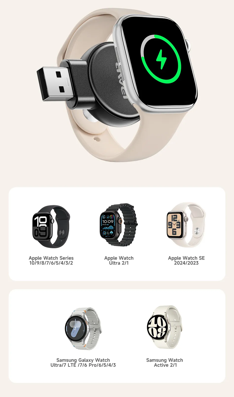 This is not only a practical but also an exceptionally versatile accessory. The charger is designed with wide compatibility in mind, so it easily supports both Apple and Samsung watches. No matter which smartwatch you use, you can be sure that charging will be effective, convenient, and hassle-free. It’s the ideal choice for those who appreciate solutions tailored to various devices and want to ensure that one accessory meets many needs.