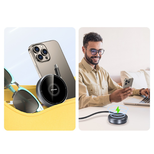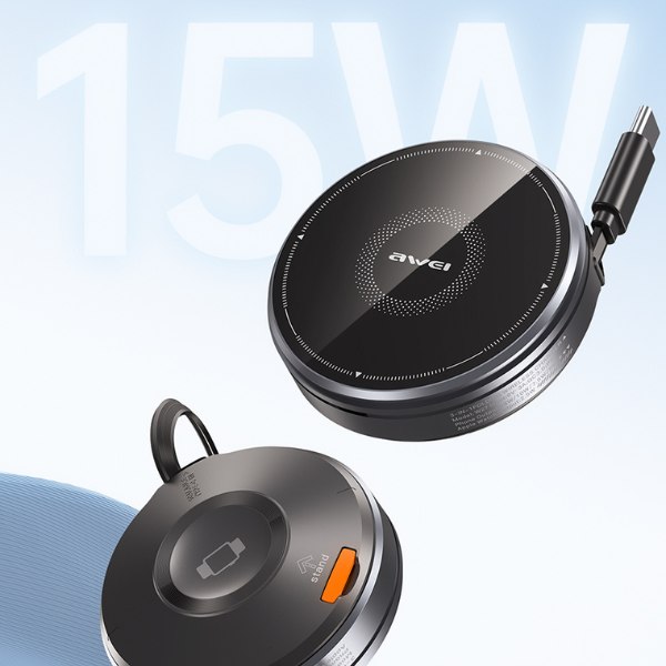 AWEI W27 It is a modern, compact wireless charger with power. up to 15 W, which will take care of your phone, smartwatch, and headphones. Thanks to the protocol Qi provides wide compatibility and fast charging for devices from Apple, , Samsung and other manufacturers. Perfect for the office, home, and even travel – no cables, no mess, no stress.