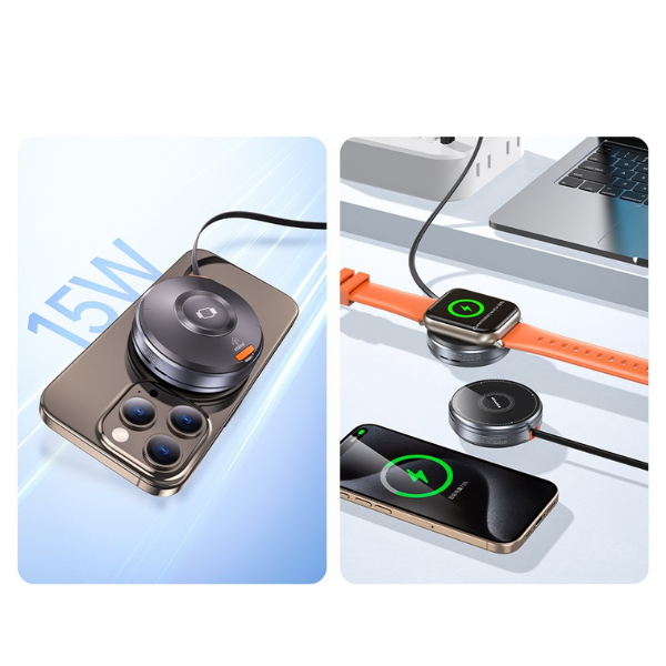 Thank you intelligent design, The front of the charger is designed for phones, while the back is for watches or headphones. Built-in USB-C cable of length 85 mm It is hidden inside the casing, which additionally increases user comfort and mobility. It fits in any pocket or bag – ready to go at any moment.