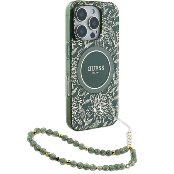 This elegant collection will delight even the most discerning and sophisticated tastes. The outer layer of the case features a subtle, golden, botanical pattern that adds elegance and class. The centerpiece of the case is a golden MagSafe ring, surrounding the stylish GUESS logo, which adds prestige and highlights the exceptional design. The whole is complemented by a tasteful beaded keychain, perfectly matching the color scheme of the case, with letters forming the name "GUESS," making this accessory not only practical but also exceptionally fashionable.