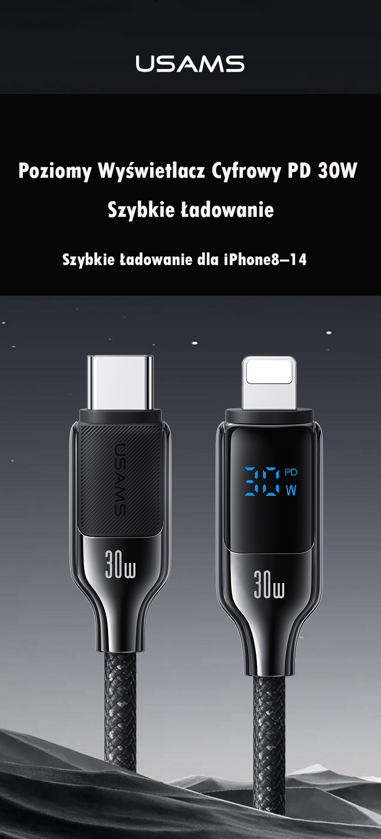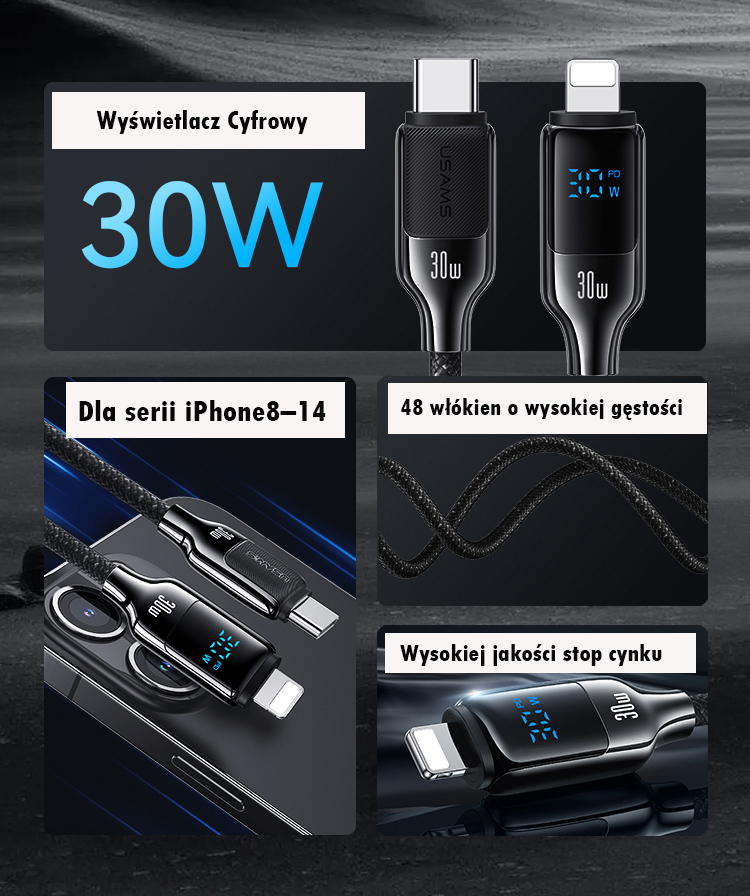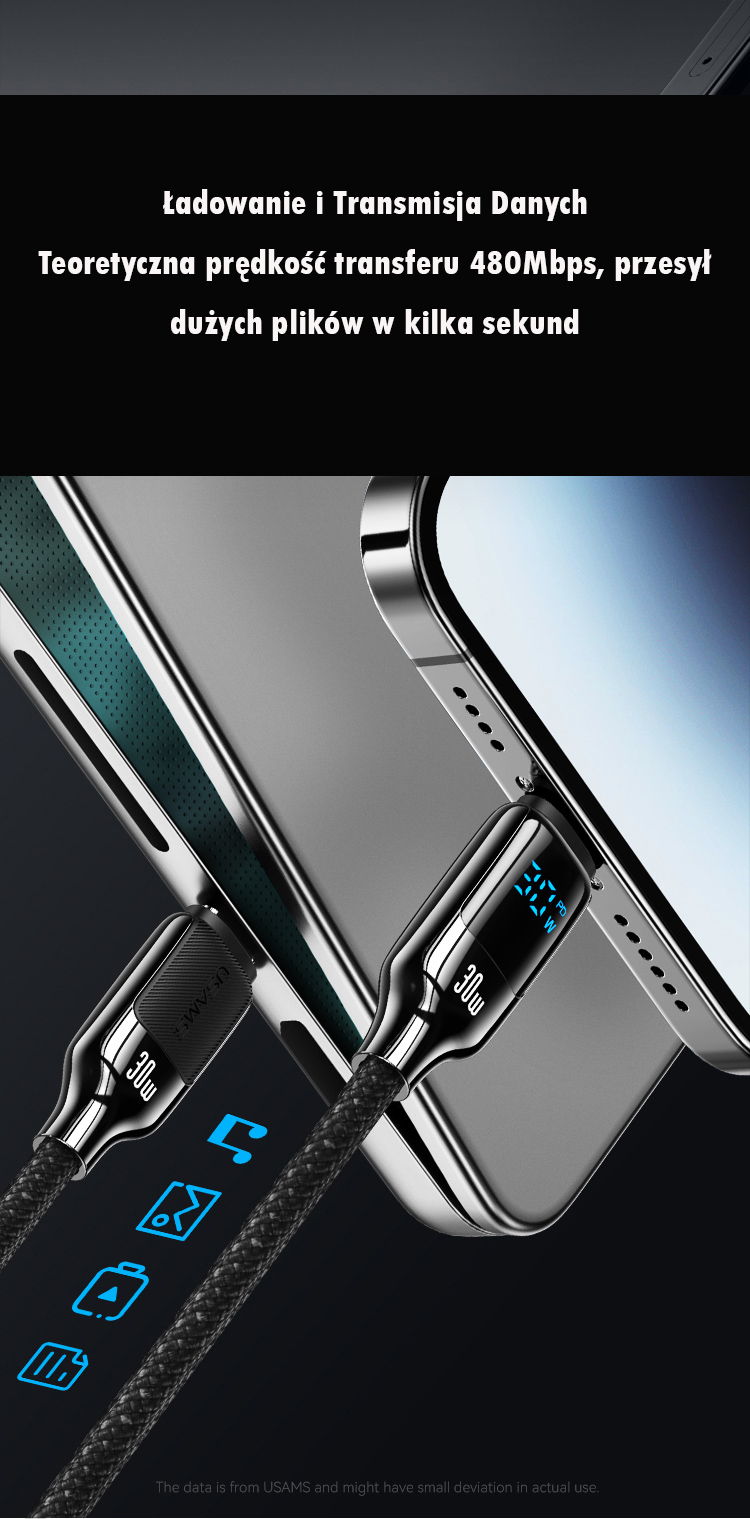 30W fast charging and data transfer cable. The cable in a nylon braid features a built-in LED display showing the charging value in real time. It has USB-C/Lightning type plugs. The cable has high bend resistance. Data transfer speed is 480 Mbps. Supports fast charging for iPhone 8–14.