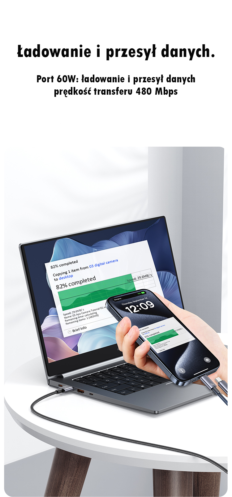 Thanks to a theoretical transmission speed of 480 Mb/s, it is possible to transfer large files in just a few seconds, which significantly facilitates office work. This fast data transfer allows for instant sharing and downloading of files, increasing work efficiency and saving valuable time for the user.