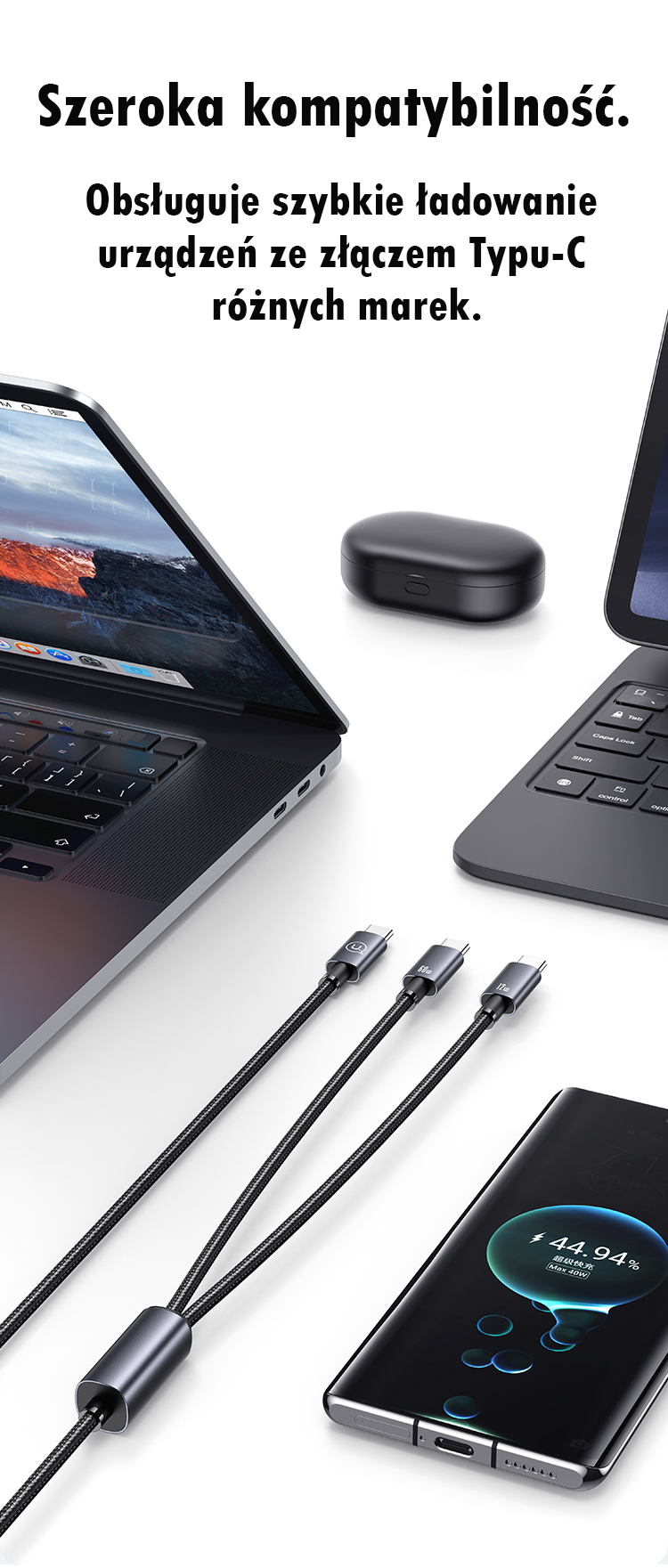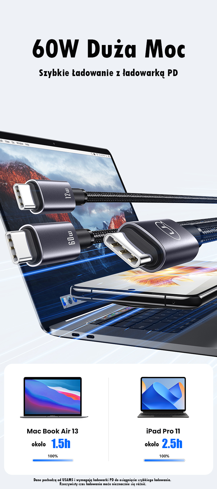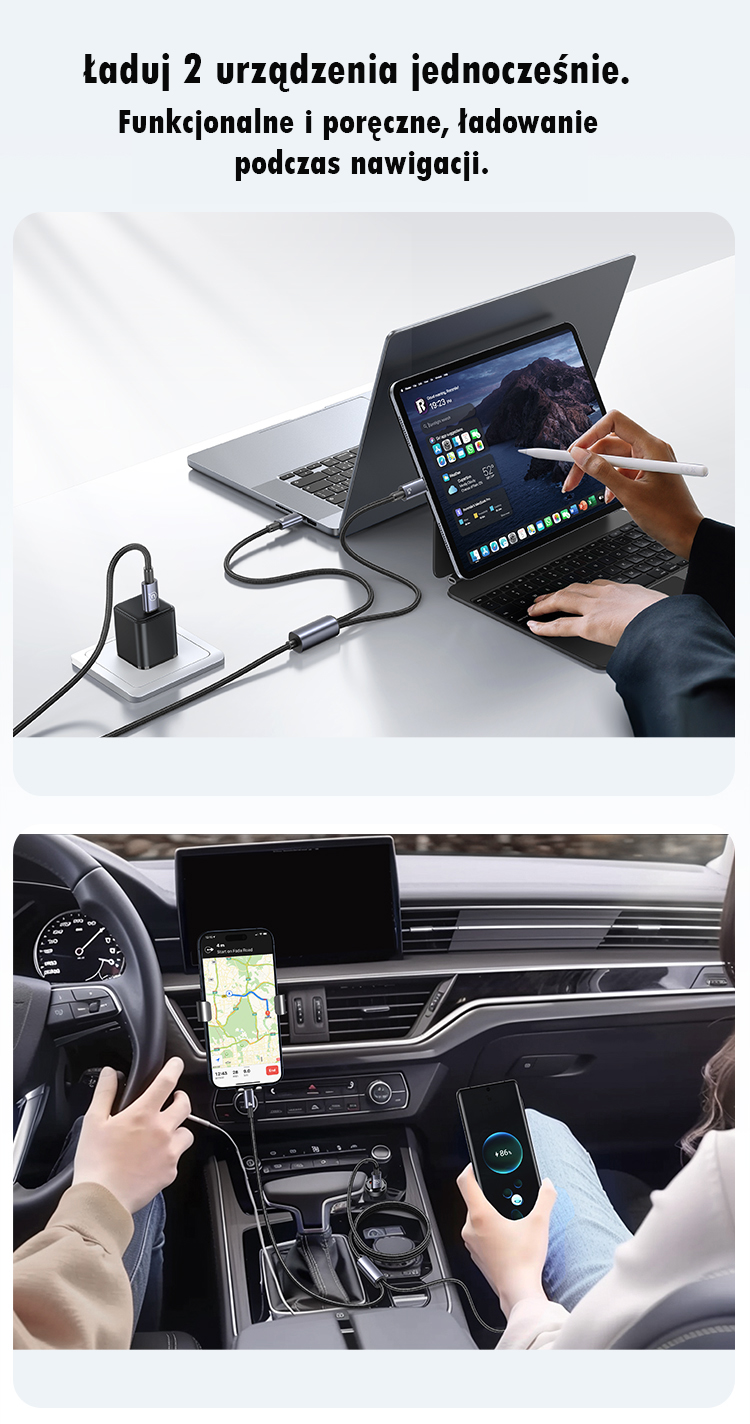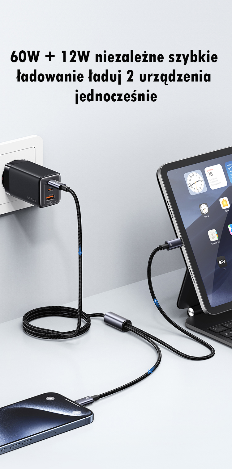 The cable allows charging one device with a power of 60W and the other with a maximum power of 12W.