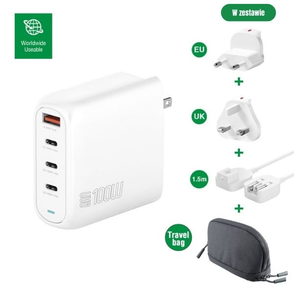 | Set | 1x GaN Flex Pro 100W charger, 1x EU plug, 1x UK plug, 1x 1.5 m extension cord, 1x organizer |