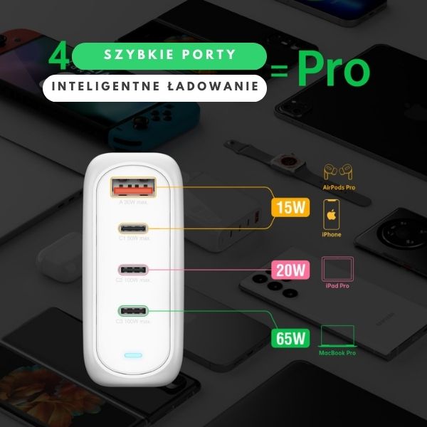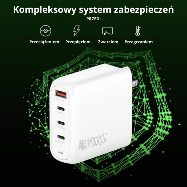 You're welcome! three USB-C ports I one USB-A You can charge up to at the same time. four devices, saving time and space. Power 100W guarantees rapid charging for even the most demanding devices, such as laptops, while also providing safe and efficient power for smaller gadgets.