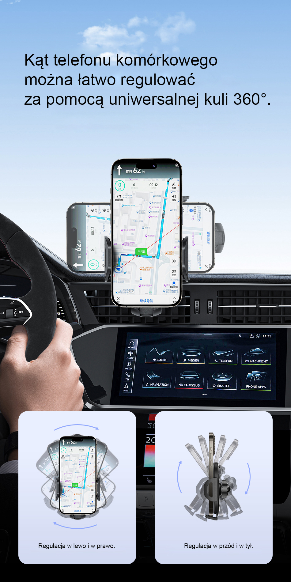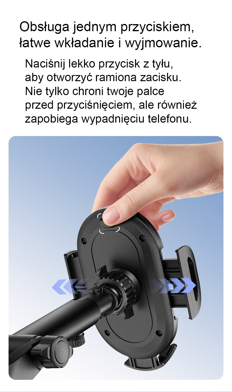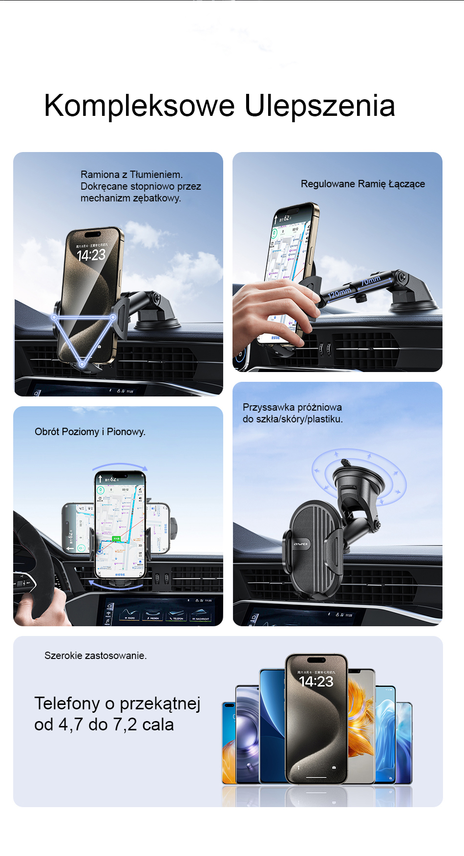 Car phone holder, mechanically locked. Arms with damping tightened with a ratchet. Adjustable connecting arm. The mechanism allows for horizontal and vertical rotation. The holder supports devices with a diagonal from 4.7 to 7.2 inches. Mounting with a vacuum suction cup.