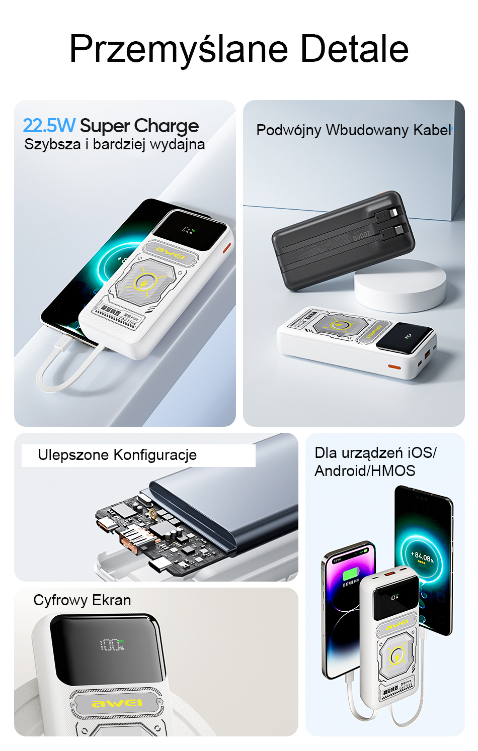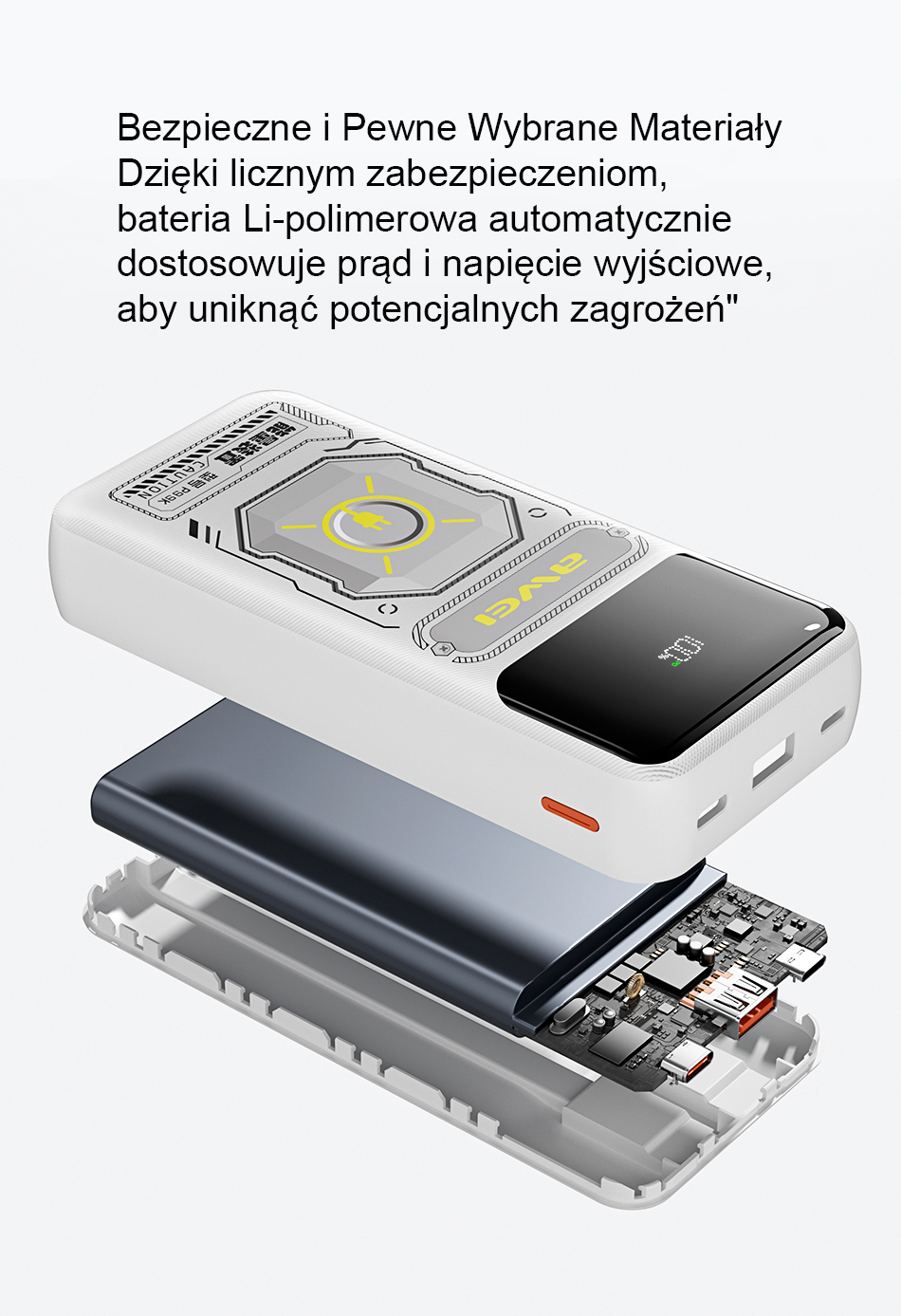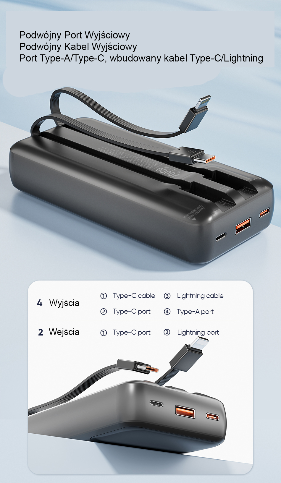 A power bank with fast charging capacity of 20,000mAh, featuring two built-in cables (USB-C and Lightning) and a display that shows the charging status in real time. It offers precise monitoring of the battery level in real time during discharge and self-charging to avoid the problem of insufficient power. Whether you're shopping, hiking, or traveling, you don't need to take any charging cables with you when you leave home. The device has a dual output port, dual output cable (Type-A/Type-C), and a built-in Type-C/Lightning cable. With numerous safety features, the device's Li-polymer battery automatically adjusts the output current and voltage to avoid potential hazards.