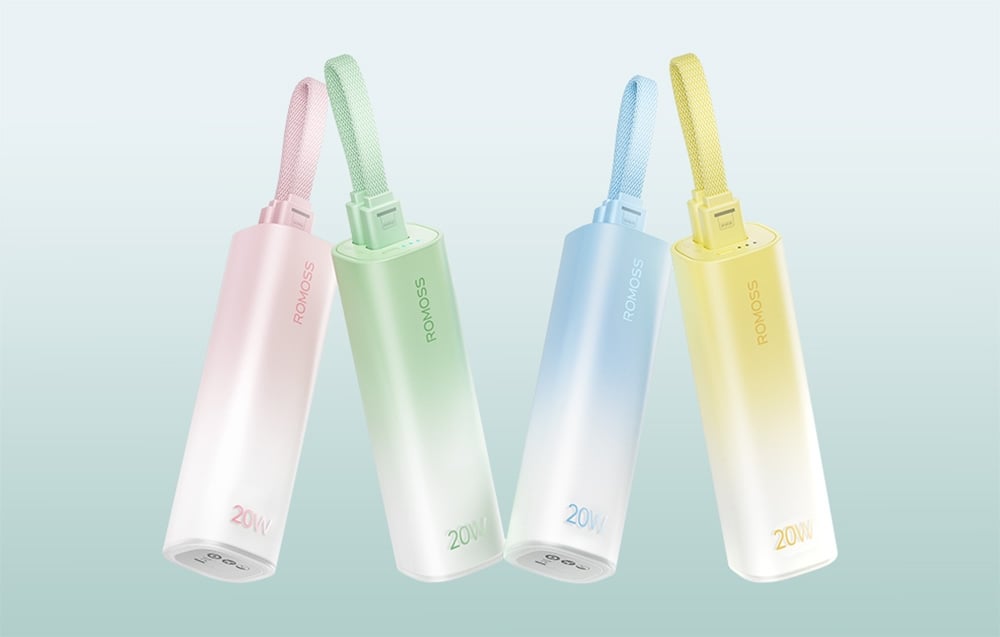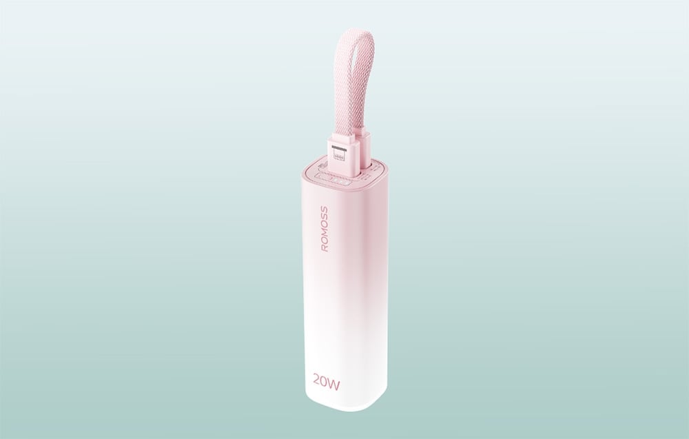 The mini powerbank Romoss PSC05P combines compact design with elegant aesthetics. The pink casing with a subtle gradient evokes the blooming of a cherry blossom garden, and its small size – comparable to a foundation bottle – makes it easy to fit in your pocket, handbag, or even with your keys. It is an excellent choice for those who value mobility and style, needing a reliable source of energy during the day.