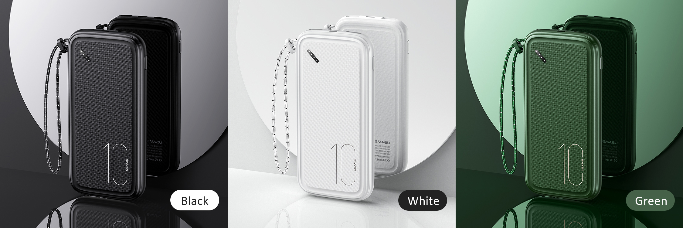 The power bank is equipped with a practical strong strap that you can put on your wrist or attach to a backpack or bag, ensuring that you always have it with you and that it won't get damaged from accidental drops while charging your device. The device has been covered with a waterproof layer that additionally protects it from dirt and fingerprints.