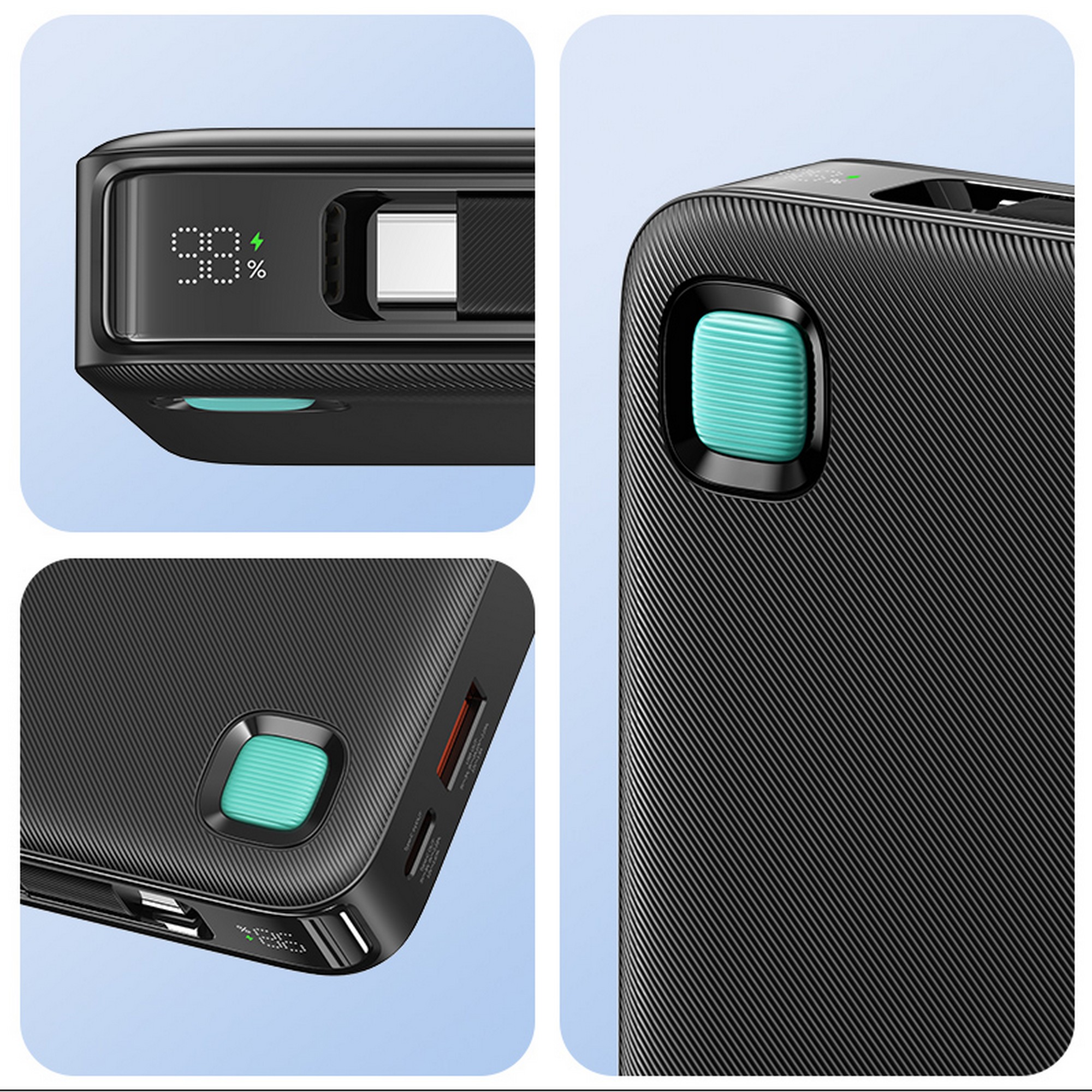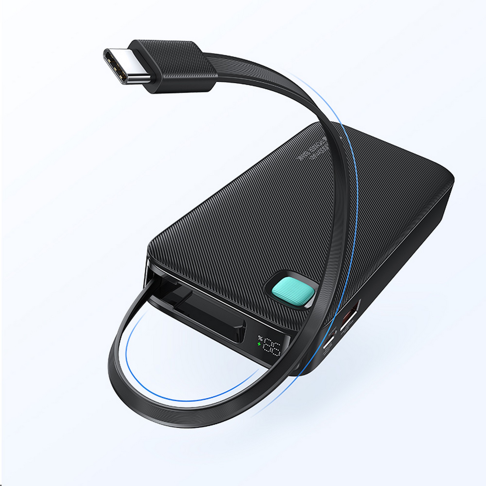 The uniqueness of this power bank is the integrated USB-C cable. The cable is very convenient for everyday use, retracting inside the power bank, making it easy to store. The adjustable length of 50 cm is fully sufficient to comfortably connect your phone for quick battery charging.