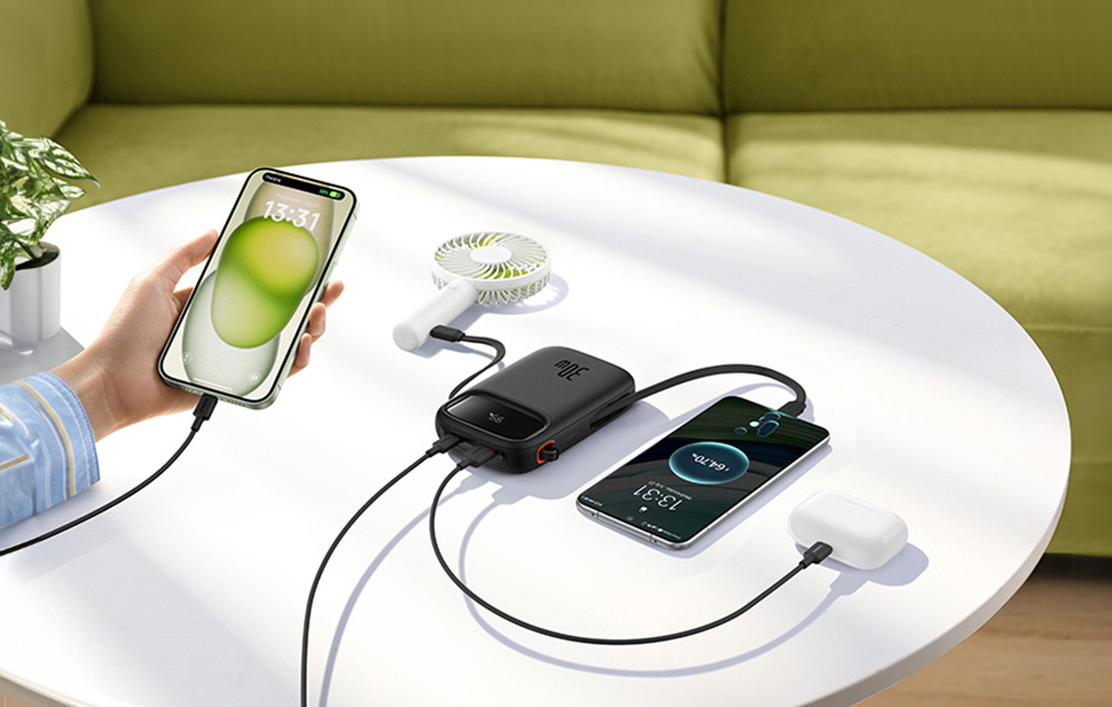 Baseus QPow 2 allows simultaneous charging of up to four devices thanks to built-in USB-C cables and additional USB ports. This functionality is perfect for those who need to charge multiple devices at once, such as a smartphone, tablet, wireless headphones, or smartwatch. All this is made possible by advanced fast charging protocols, such as PD3.0, QC3.0, SCP, and many others.