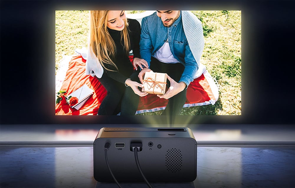 The projector is equipped with HDMI and USB ports, enabling you to connect various devices such as laptops, gaming consoles, TV sticks, or media players. This makes it easy to watch your favorite content on the big screen – for example, Netflix series or YouTube videos.