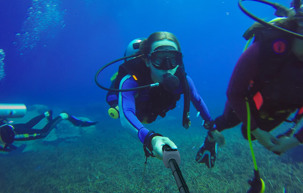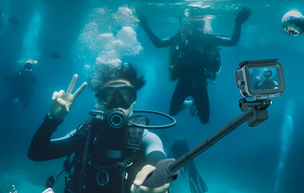 The selfie handle allows for remote control of the camera underwater, enabling you to capture unforgettable moments while diving. It is equipped with a remote control function, allowing you to take photos at any time. The total length of the handle is 85 cm, which is perfect for photographing underwater scenes, such as coral reefs or underwater landscapes.
