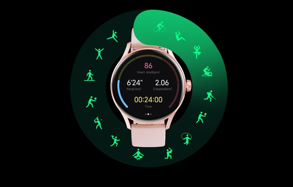 The 1.19-inch AMOLED display with a resolution of 390 x 390 pixels provides a sharp image and vivid colors. The Always-On Display feature allows for quick viewing of the time and notifications without the need to wake the screen. Four brightness levels enable adjustment of the image to lighting conditions, while the 2.5D glass protects the screen from scratches while enhancing the visual appeal of the device.