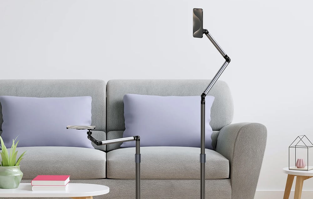 The versatile joint provides complete flexibility—you can adjust the tilt angle of the stand in various planes. These settings allow you to achieve perfect shots in portrait mode, from high and low angles—the possibilities are endless. This solution gives you full control over the frame, regardless of the type of material being recorded, whether it's a live stream or short videos for social media. But that's not the end of the advantages! The stand supports various types of accessories mounted with a 1/4'' screw, such as additional lighting, allowing you to achieve exactly the effects you plan!