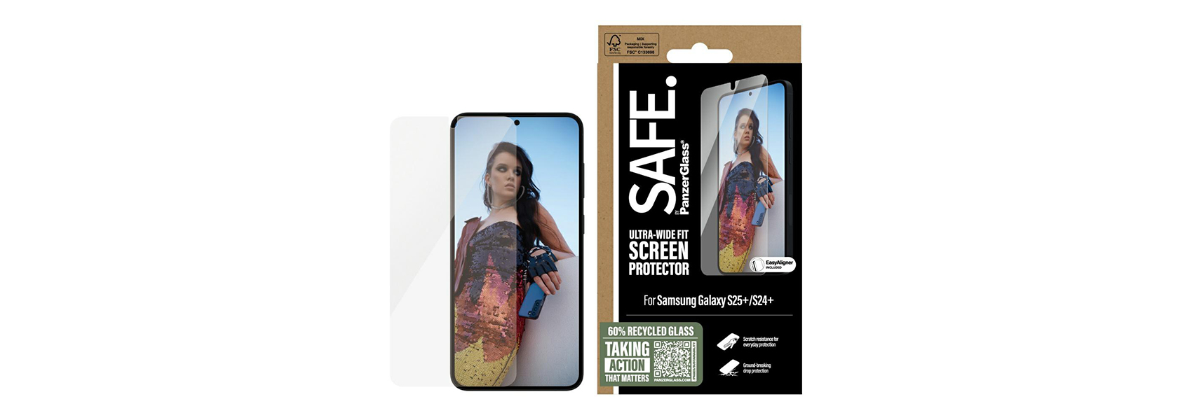 SAFE. is really. SAFE. is for you. SAFE. is in case of mishaps on the dance floor, failed selfies, and everyday clumsiness, falls, and screen cracks. This protective film SAFE. by PanzerGlass®️ made of 60% recycled materials acts like a discreet airbag, protecting the phone by absorbing impacts and providing a high level of scratch resistance without compromising the functionality and appearance of the device. It even has a smudge-resistant coating that reduces fingerprints and grease marks and ensures 100% compatibility with the ultrasonic fingerprint reader on the screen.