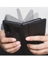 Tylny panel etui to skórzany mini portfel na karty płatnicze lub dokumenty. Kieszonka jest zamykana na klips i bezpiecznie utrzymuje zawartość na swoim miejscu.
