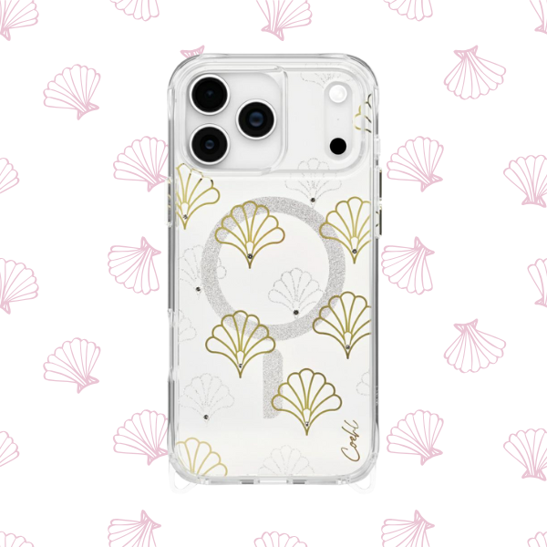 Motyw muszelek na przezroczystej powierzchni oraz srebrny pierścień nadadzą Twojemu urządzeniu delikatny, elegancki charakter.