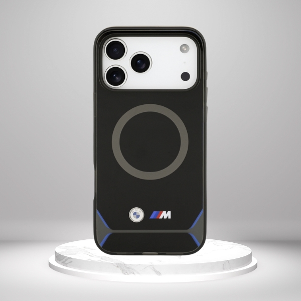 Na tylnej części umieszczono zintegrowany pierścień MagSafe, a dolną część zdobią subtelne niebieskie linie dekoracyjne oraz logo BMW M, które podkreślają sportowy charakter i precyzję wykonania.