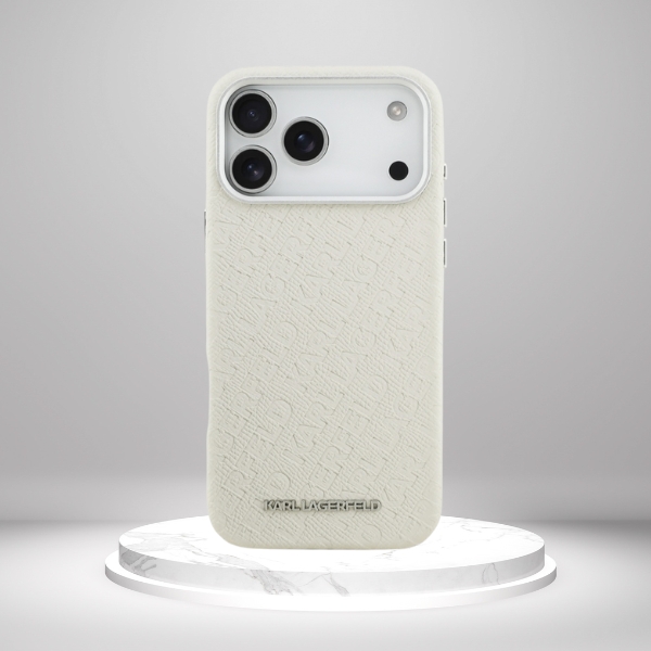 Powierzchnię etui pokrywa wytłaczany wzór z powtarzającym się napisem „Karl Lagerfeld”, a w dolnej części znajduje się eleganckie srebrne logo Karl Lagerfeld.