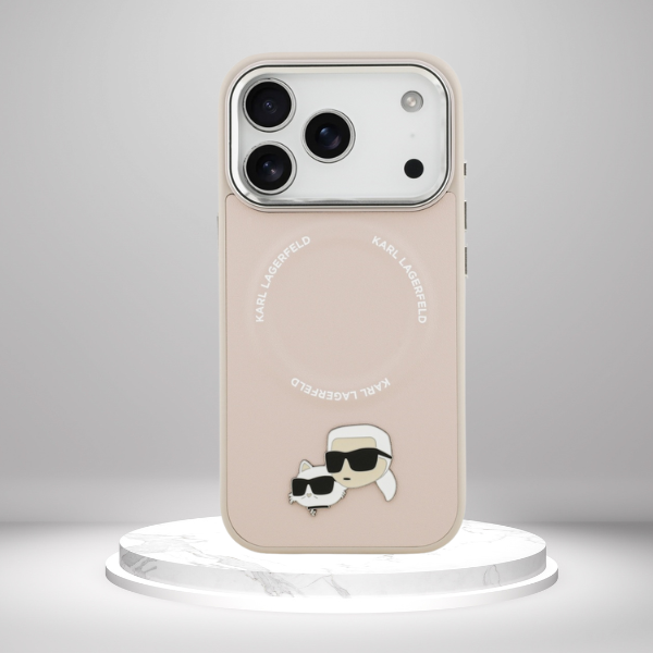 Plecki zdobi charakterystyczny metalowy pin z podobiznami Karla Lagerfelda i jego kotki Choupette, nadający akcesorium unikalnego, modowego charakteru. Całość dopełniają aluminiowa ramka aparatu oraz przyciski boczne w srebrnym kolorze, podkreślające luksusowy charakter produktu. Na pierścieniu MagSafe znajduje się napis „KARL LAGERFELD”, który dodaje elegancji i wyjątkowego stylu.