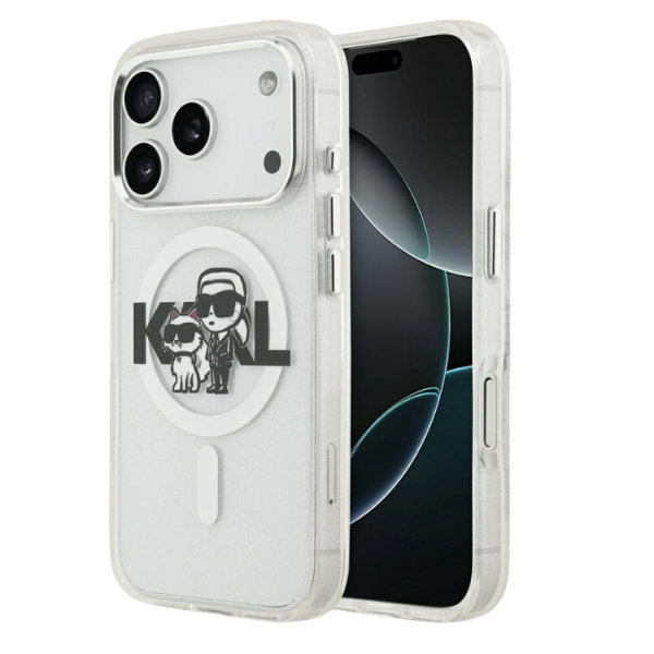 Etui Karl Lagerfeld IML Glitter Karl & Choupette Sketch Logo MagSafe do Apple iPhone 17 Pro przezroczysty