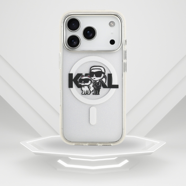 Tylną część zdobi brokat oraz nadrukowany wizerunek kotki Choupette i Karla Lagerfelda z dużym napisem KARL, dopełniony widocznym pierścieniem MagSafe.